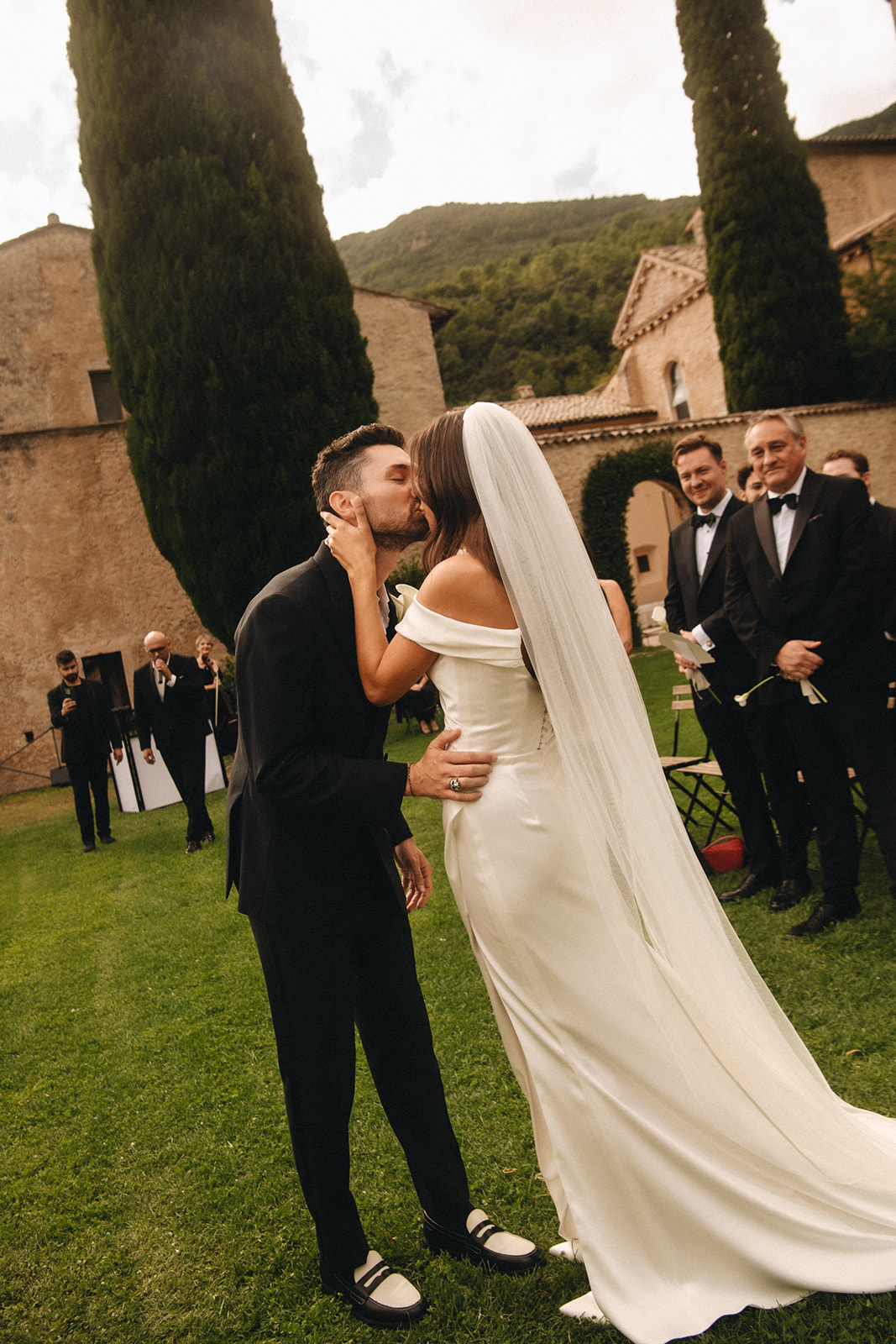 An intimate destination wedding within the ancient walls of Abbazia San Pietro in Valle, a historic monastery set in the Umbrian countryside. The courtyard, dressed with soft drapings and framed by centuries old stone, looked out over the Umbrian mountains and created a calm, timeless setting for the celebration. Thoughtfully planned by Rebecca Marie Weddings, the day felt effortless. Elegance and emotion were woven naturally through the setting, the architecture and the couple’s shared heritage, coming together in a deeply personal and quietly meaningful celebration of love.